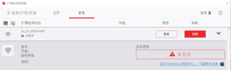 在SketchUp菜单栏中选择“窗口-扩展程序管理器”,选择“su_to_d5render”,选择卸载。
