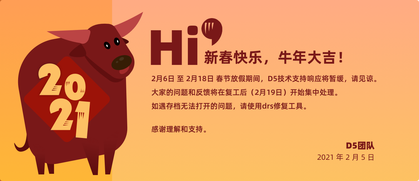 2月6日 至 2月18日 春节放假期间,D5技术支持响应将暂缓,请见谅。